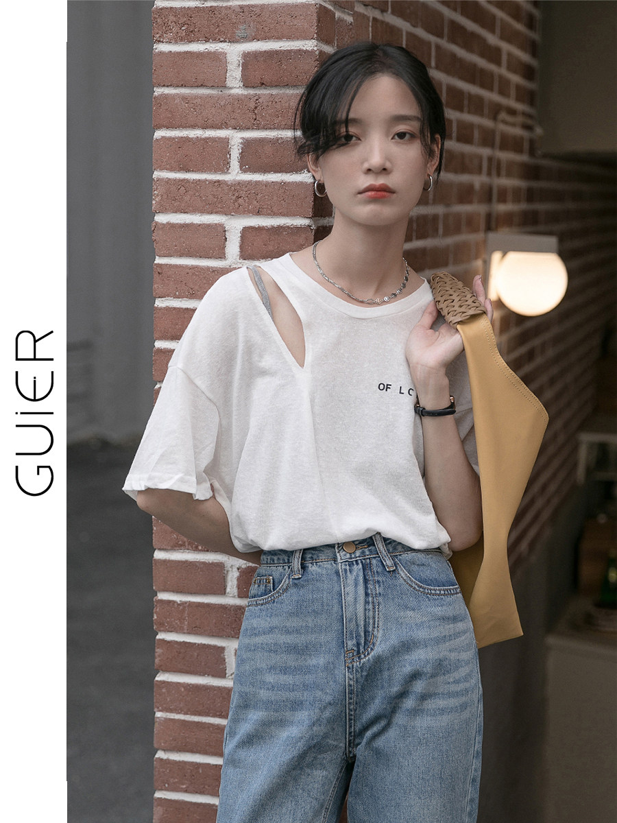 「GUIER」设计感露肩短袖t恤女2021年新款夏季拼接吊带假两件上。热门设计联盟服务商