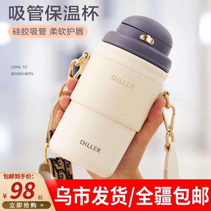 新疆包邮不锈钢保温杯户外便携背带绳斜跨吸管式保暖杯2022网红款热门设计联盟服务商